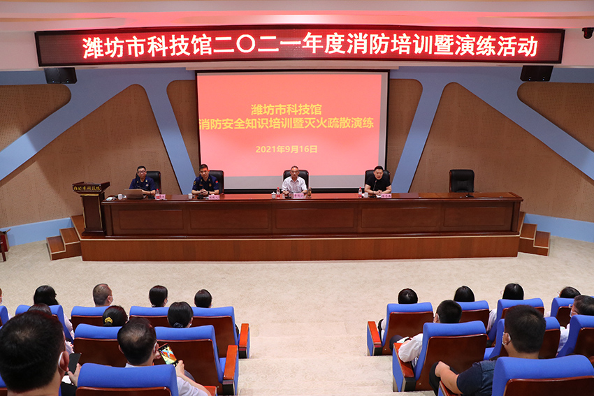 為保證濰坊市文化藝術中心各場館安全有效運行,扎實打牢濰坊市文化藝術服務中心安全基礎,提高各入駐單位、商鋪人人了解消防安全常識,加強各單位人員火災防范和應急處置能力,濰坊市科技館與濰坊市消防救援支隊及高新區消防救援大隊在濰坊市科技館聯合舉行了一次安全技能培訓及消防疏散演習。市科技館、昌大公管共計46人參加了消防演習。